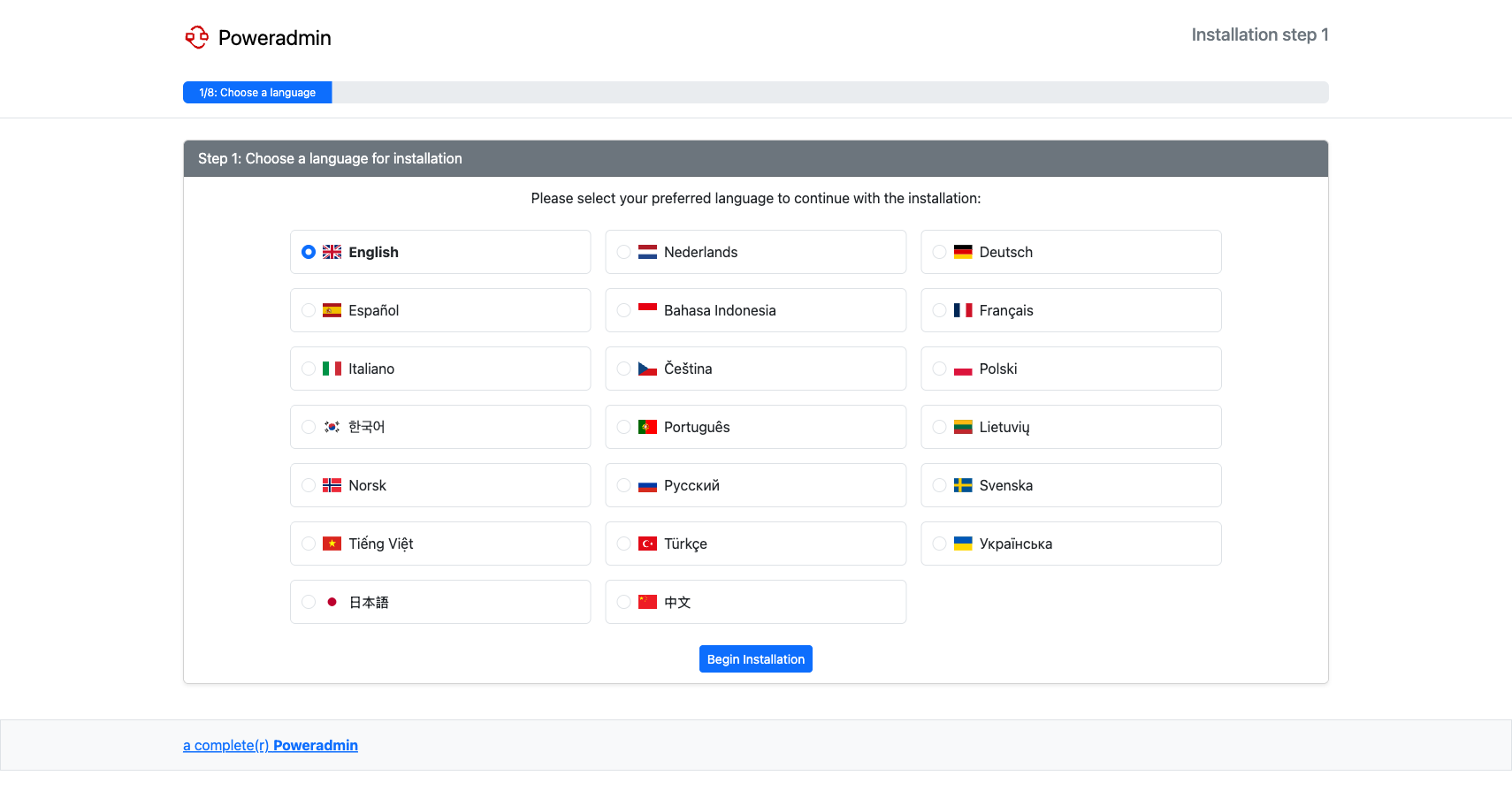 To use the wizard, navigate to your Poweradmin URL with the /install/ path (e.g., http://your-server/install/). The wizard will walk you through: