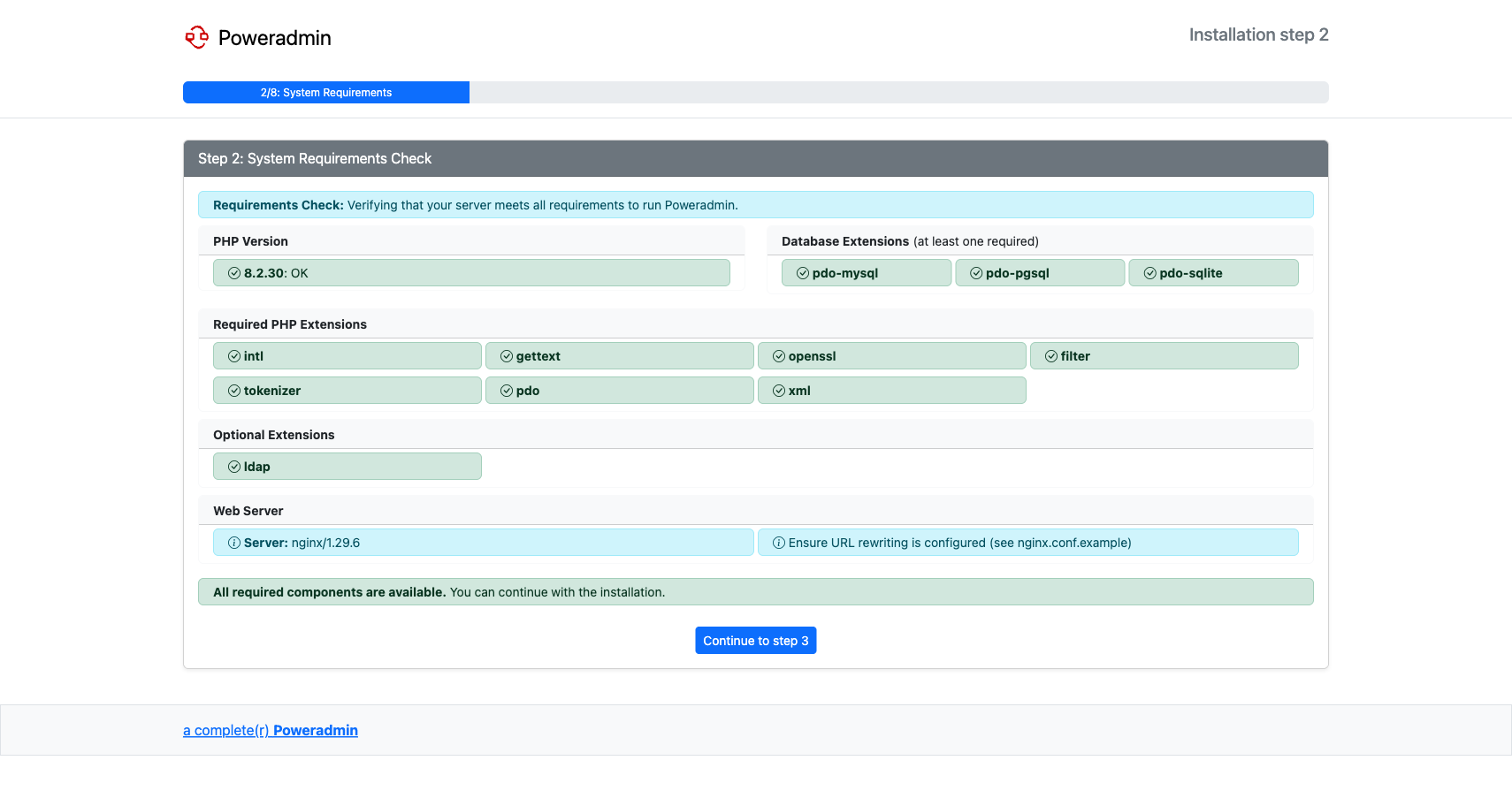 The installer checks that your server meets all requirements, including PHP version, required extensions, and database drivers.