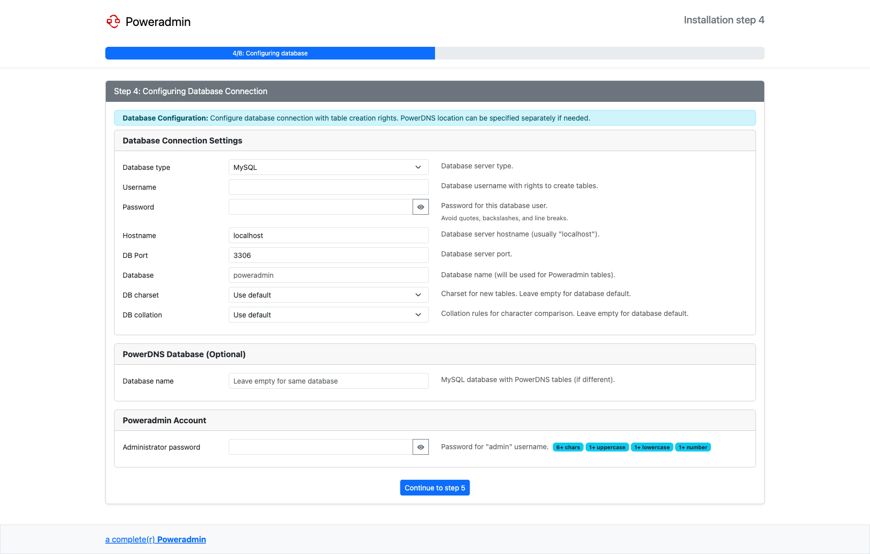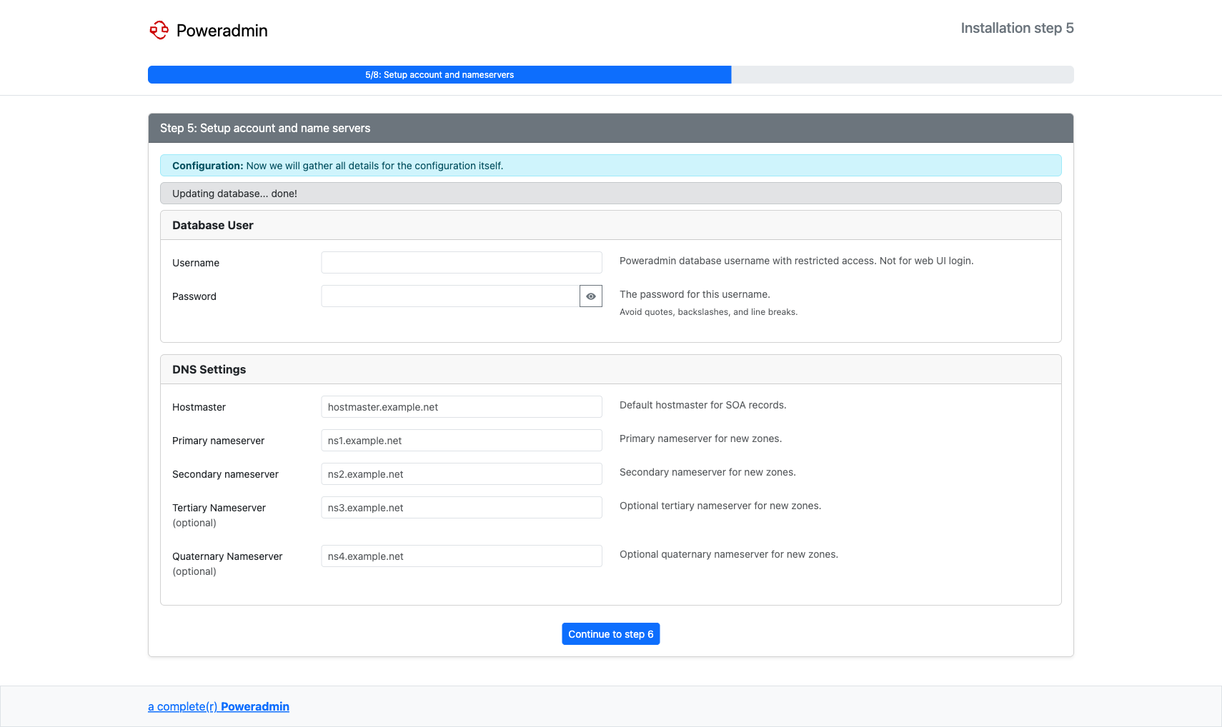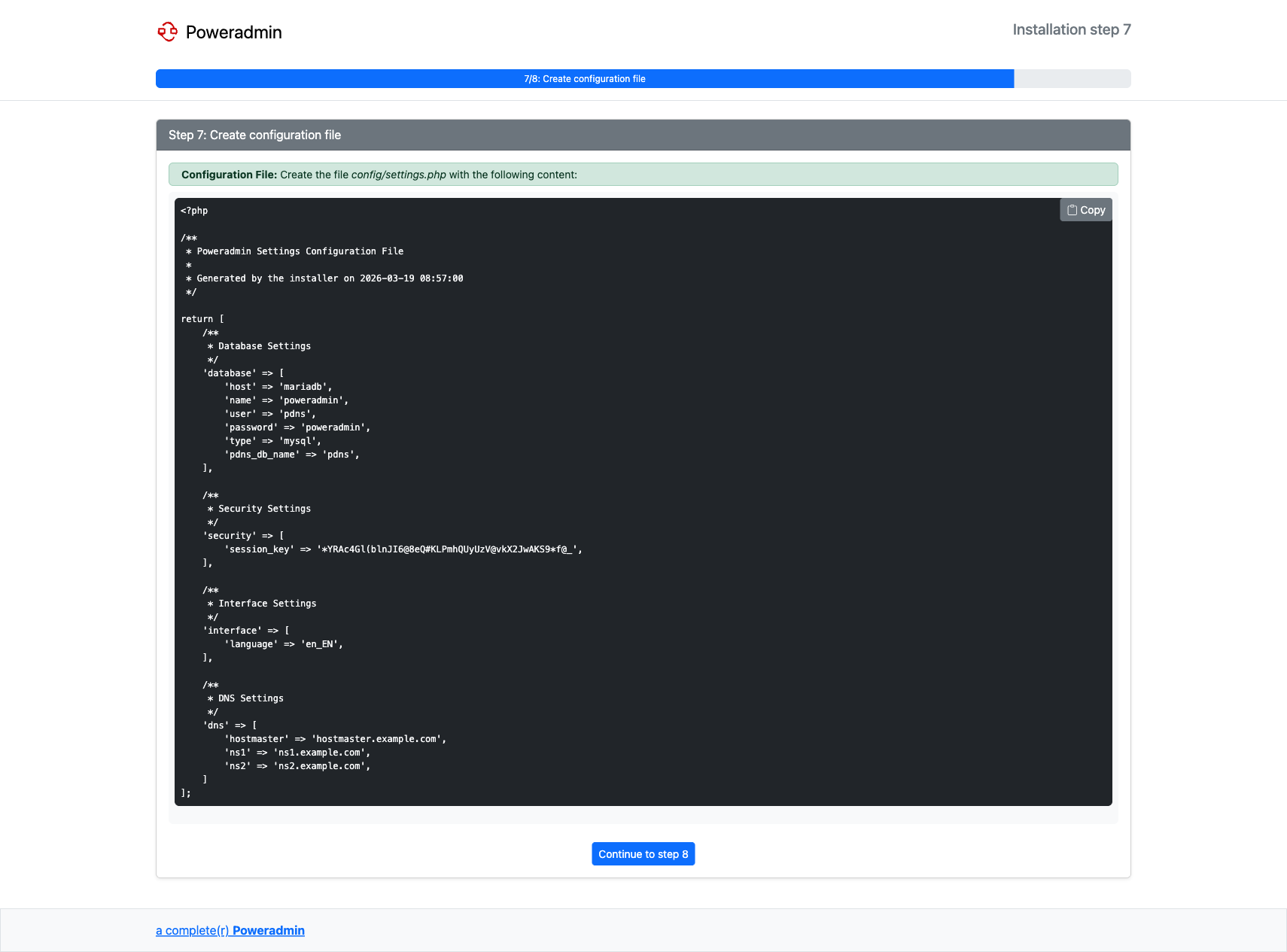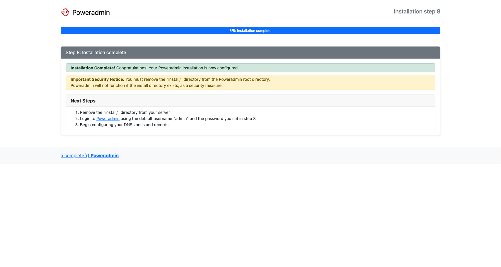 As an alternative to manual installation, Poweradmin includes a web-based installer wizard that guides you through the setup process in 8 steps.