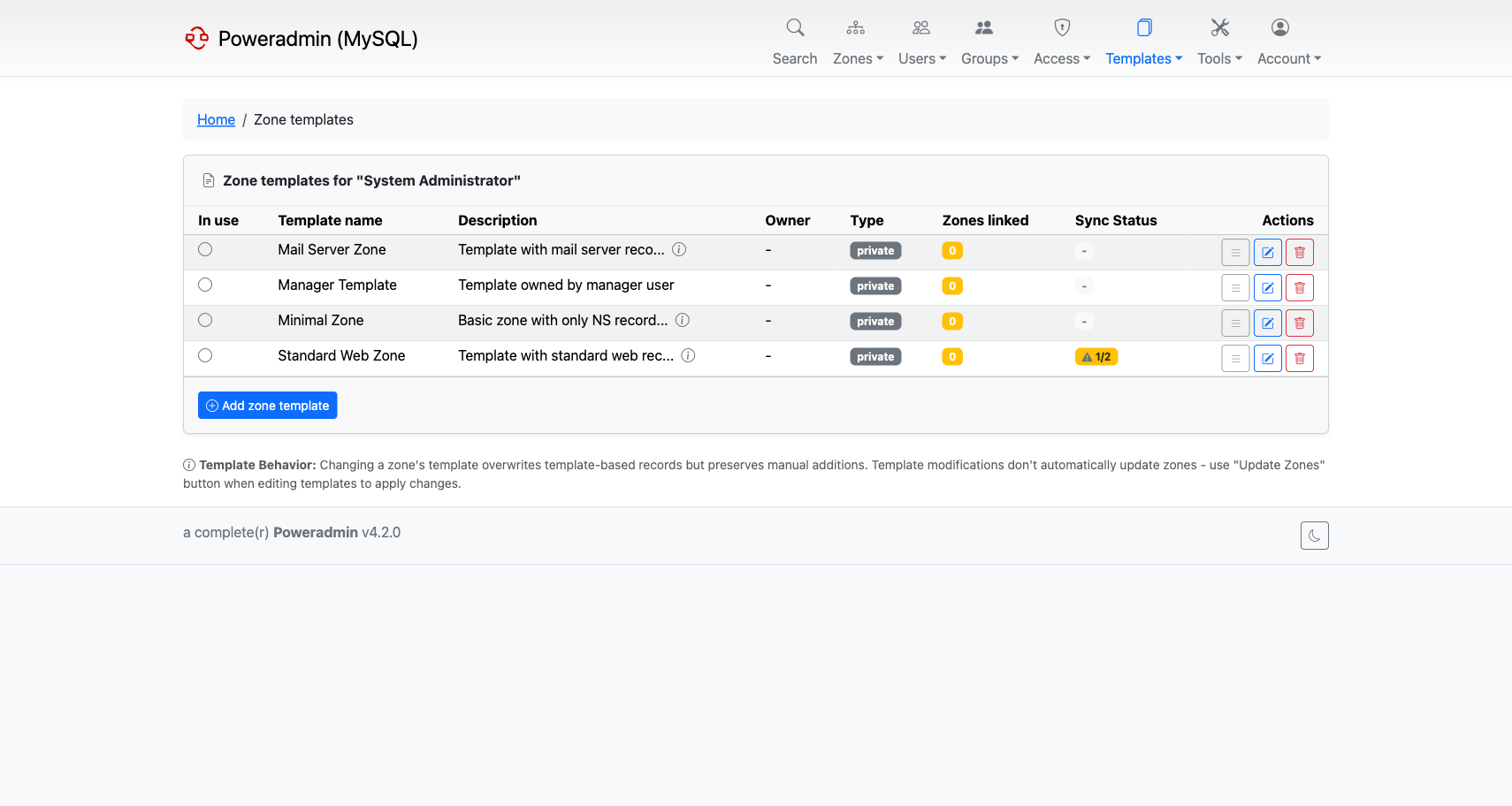 Poweradmin does not currently provide interface indicators showing which zones are "out of sync" with their templates. Administrators must manually track when template changes need to be applied to existing zones.