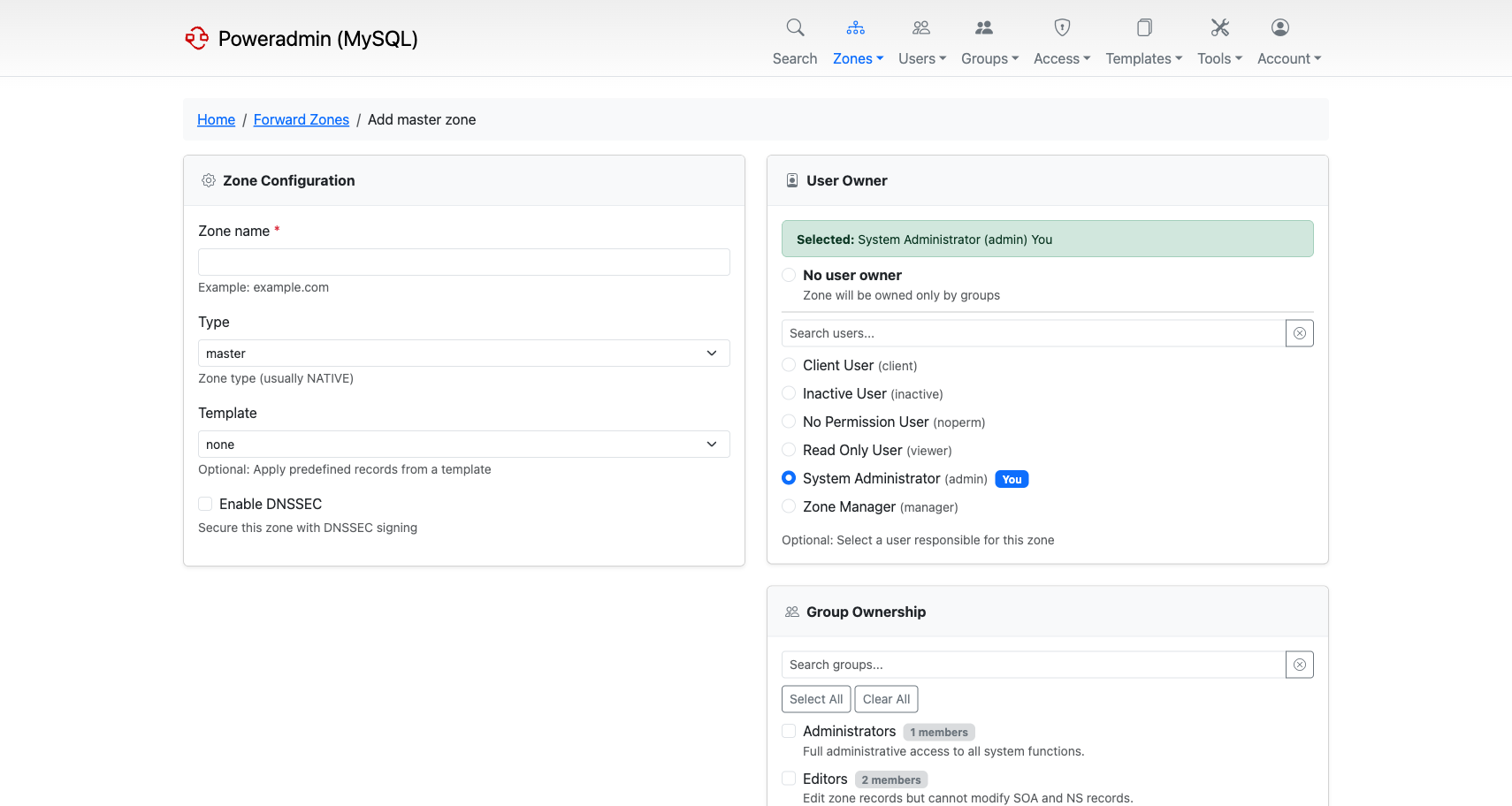 - User ownership - assign individual users as zone owners when creating or editing a zone