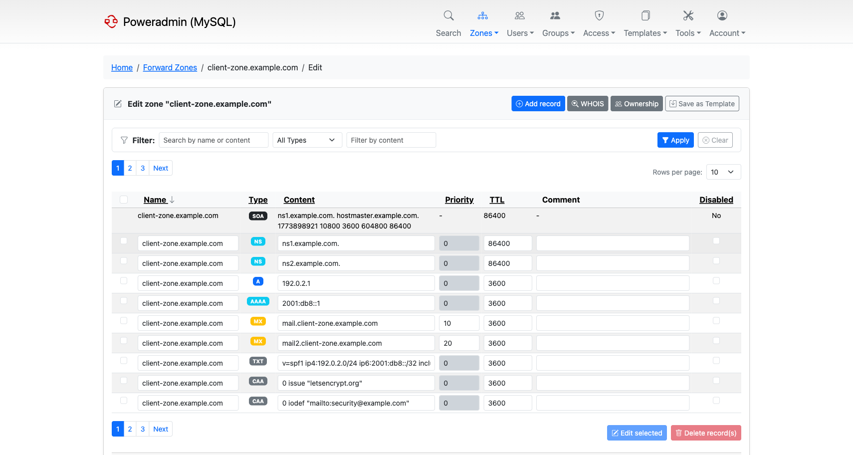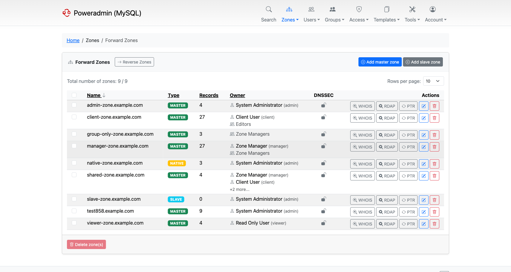 Zones are the core objects in Poweradmin. Each zone corresponds to a DNS domain (or reverse network) managed by PowerDNS. This guide covers creating, editing, and managing zones.